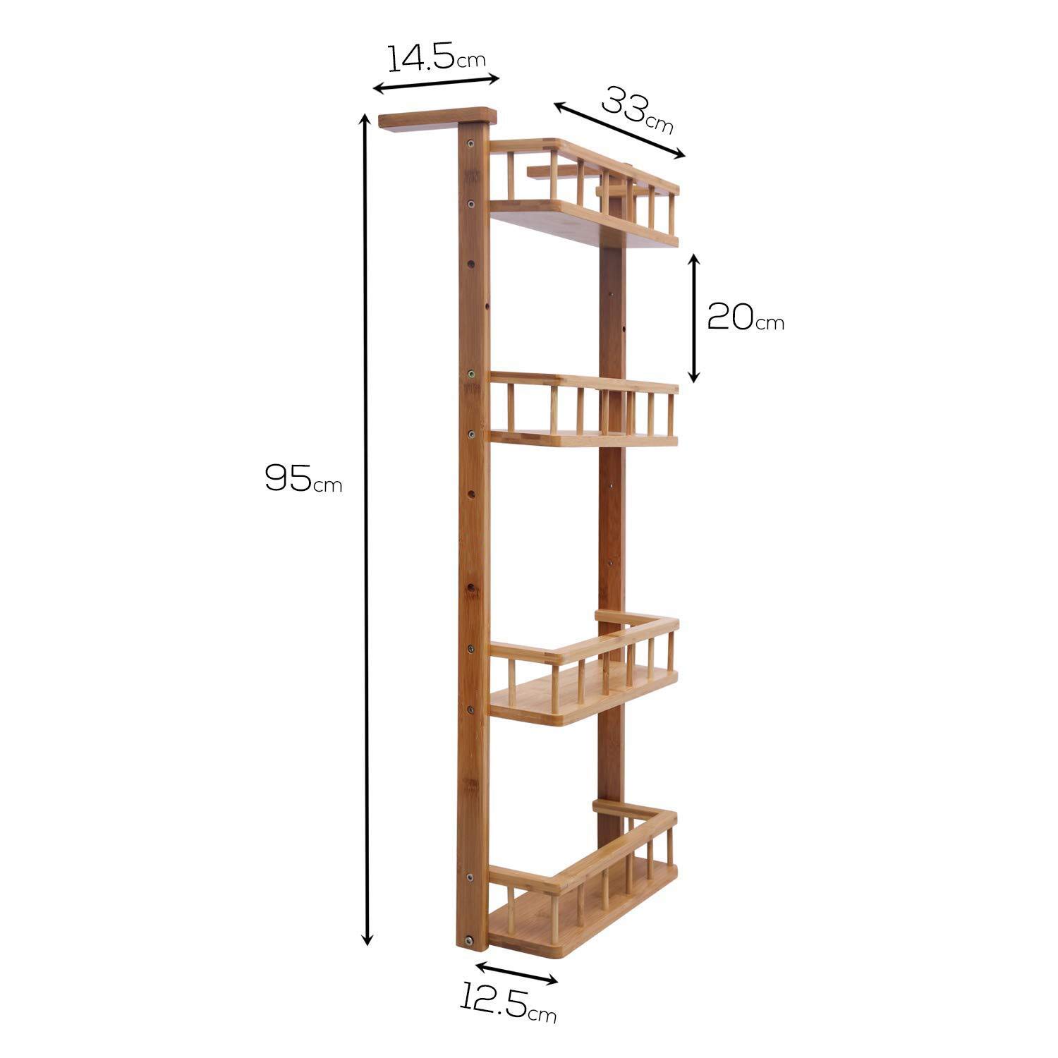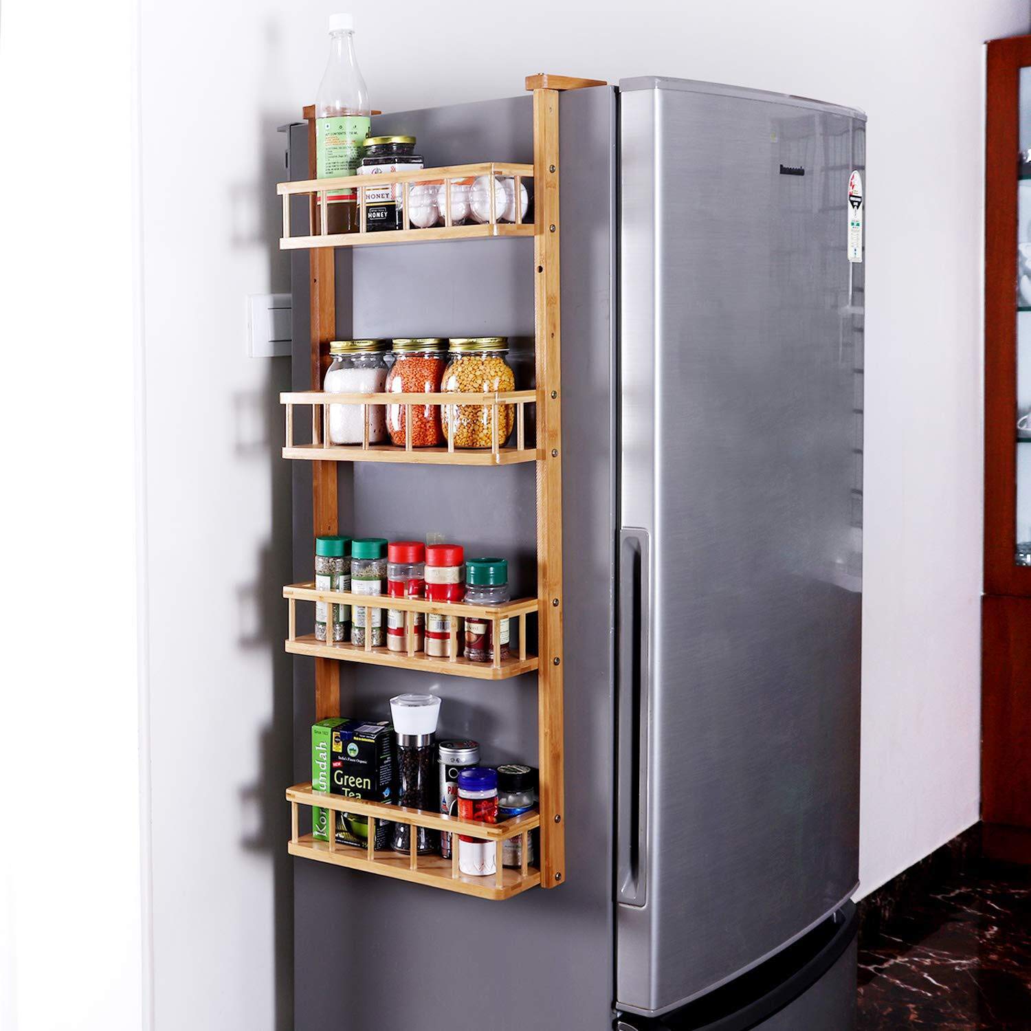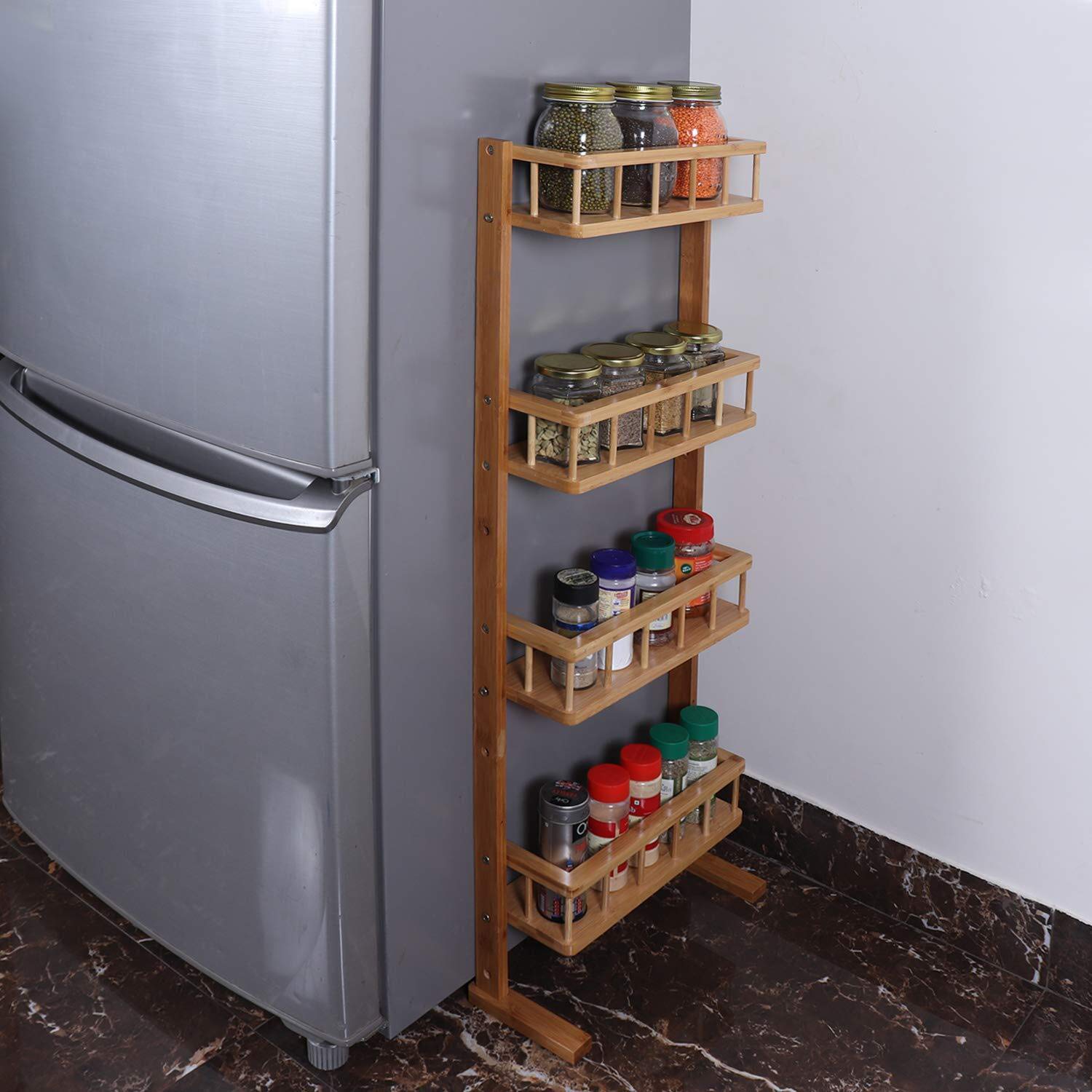 - MULTIPLE USES: The 4-tiers wall mounted storage shelf is suitable for kitchen, bathroom, door, bedroom, side of fridge, space-saving and keep room tidy. Space saving kitchen spice rack condiment stand, keep your counter organized, maximize your refrigerator, make full use of gap as your choice.