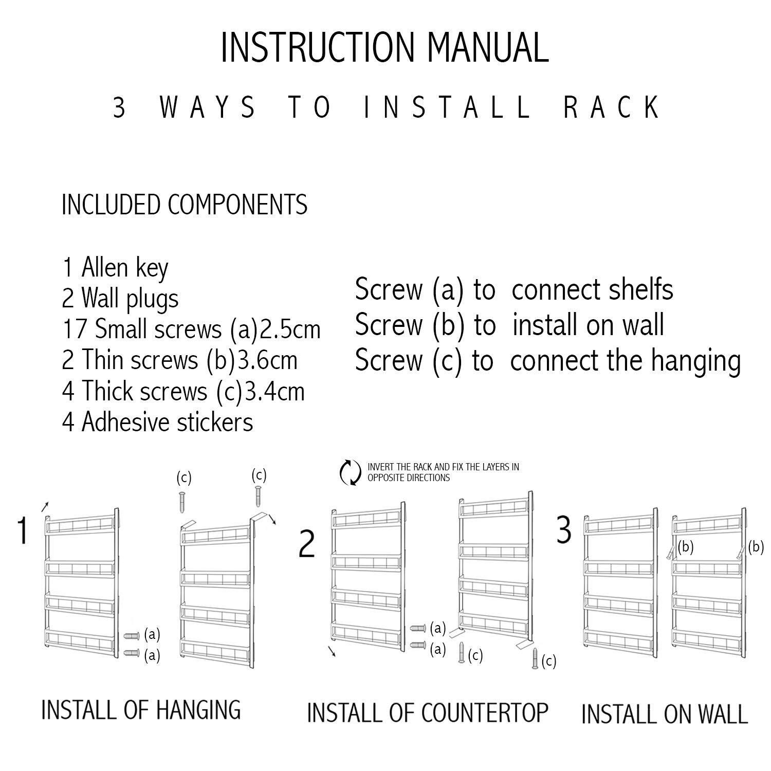 - EASY TO INSTALL: Multipurpose multifunction shelf is easy and simple to install with screws provides and store when not in use. It can be assembled in 3 ways – countertop and fridge shelf or door hanging, wall hanging.