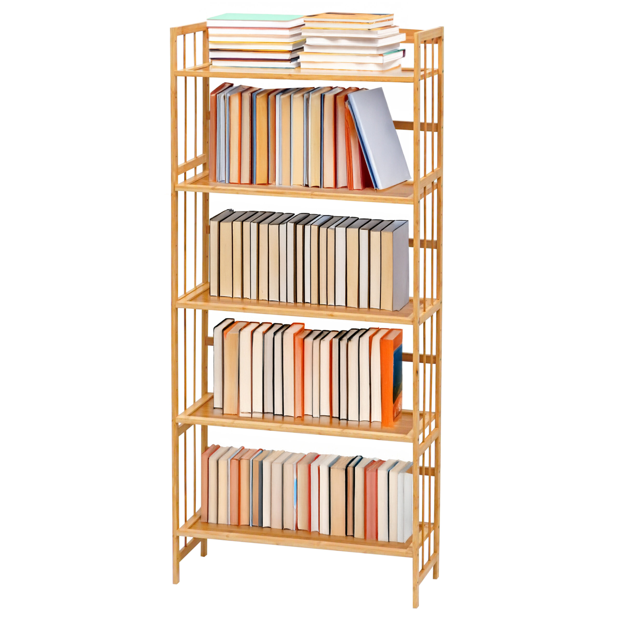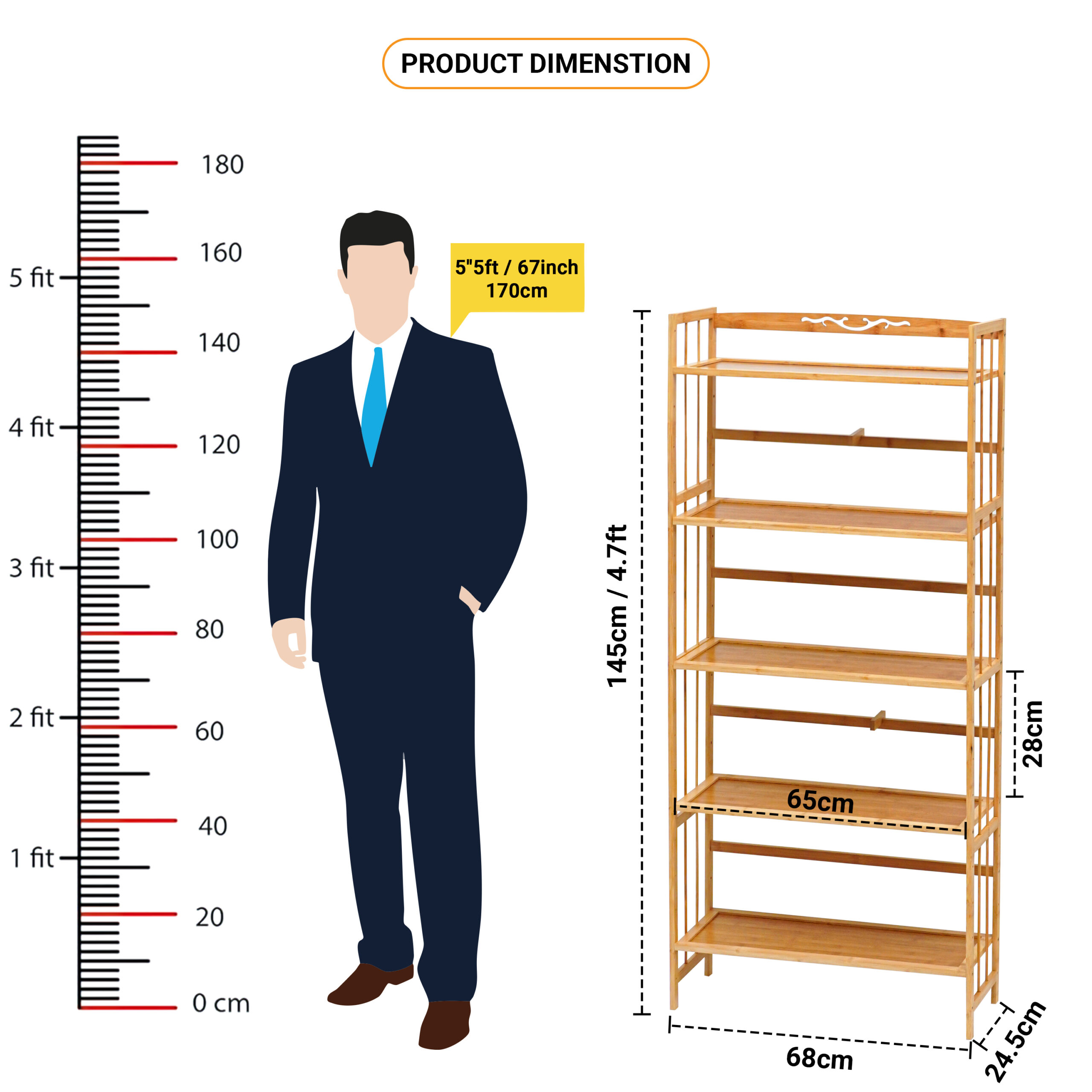 - MEASUREMENT: 5-tier book shelf of 25 cm*65 cm*150 cm (L*W*H) deep perfect fit any room, creating more storage space for your home without taking up too much space. Thick bamboo shelves with easy-to-tight screws can withstand heavy loads without being easily bent or deformed, each shelf can accommodate up to 30 Kg.