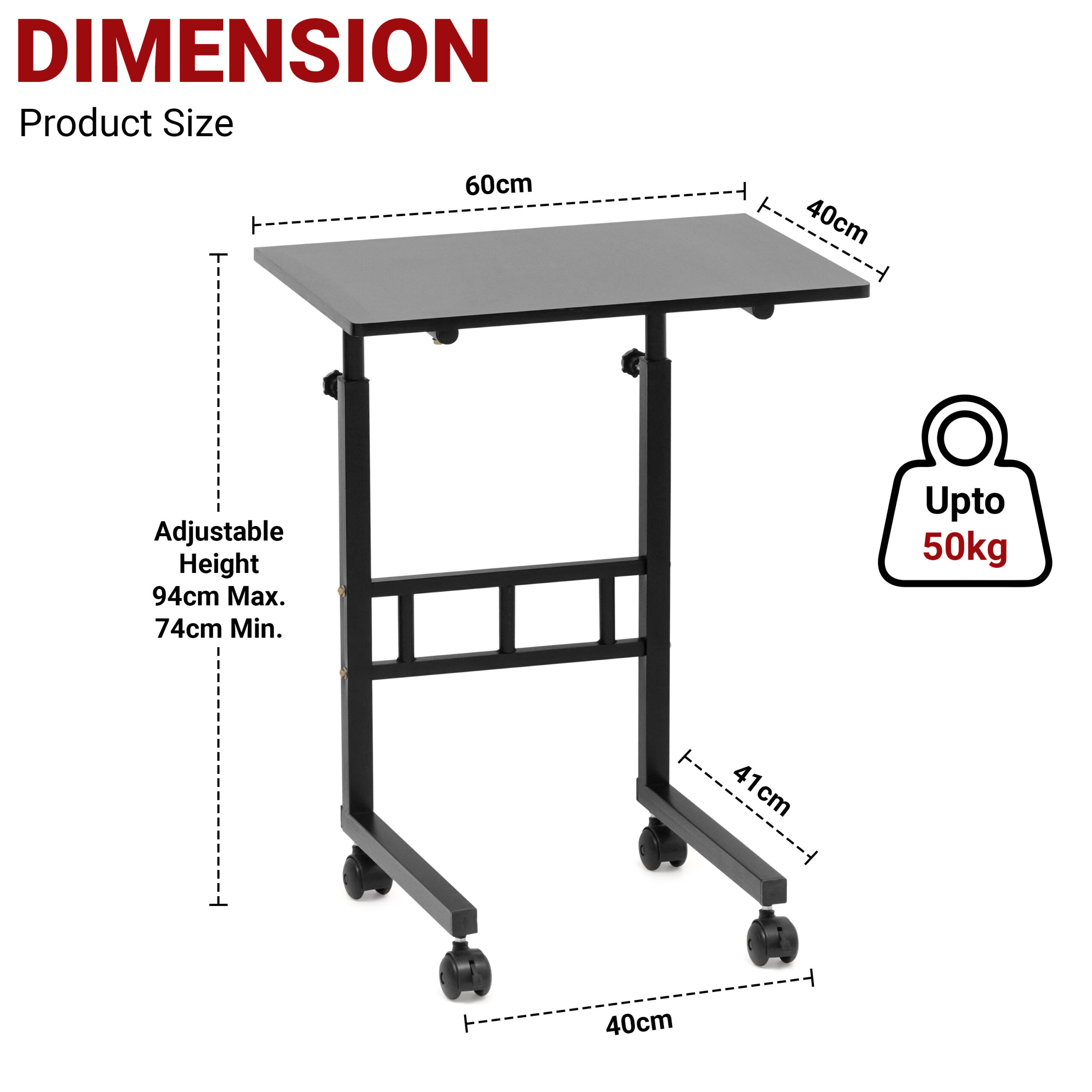 • HEIGHT ADJUSTABLE TABLE: The utility Table is made from a high-quality steel frame sturdy wood surface. The height of the portable laptop table can be adjusted from 74 cm – 94 cm as you wish, to sit or stand. It has a 50 Kg weight capacity and keeps stabilization, large enough for any size of the computer.