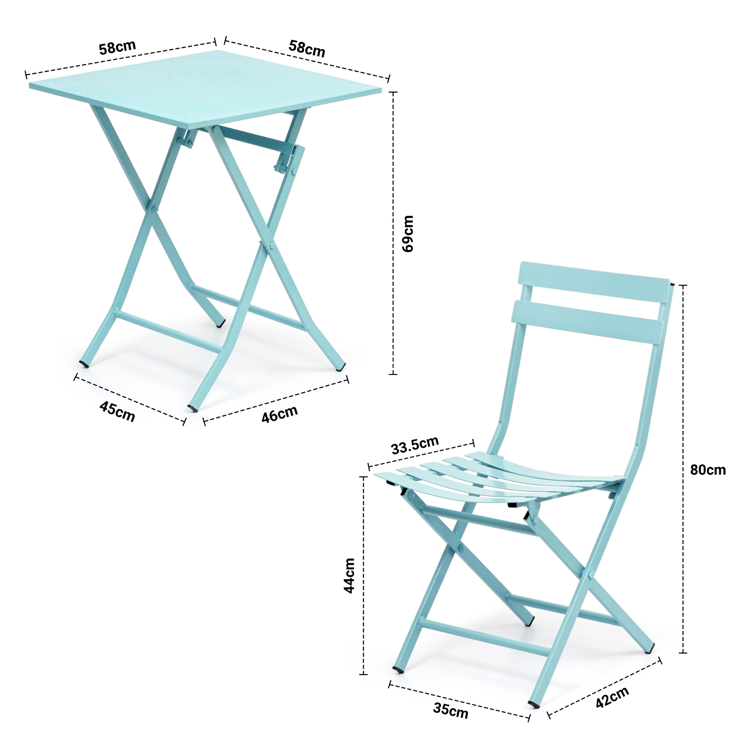 - MEASUREMENT: The patio table measures 58CM (L)*58cm (B)* 69cm (H). The camping table comes with 2 chairs. The chair measures 33.5 cm (L)* 35 cm (B)* 80 cm (H). The metal foldable table and chair set can be easily folded and stored, which is ideal for transportation and easy to keep.