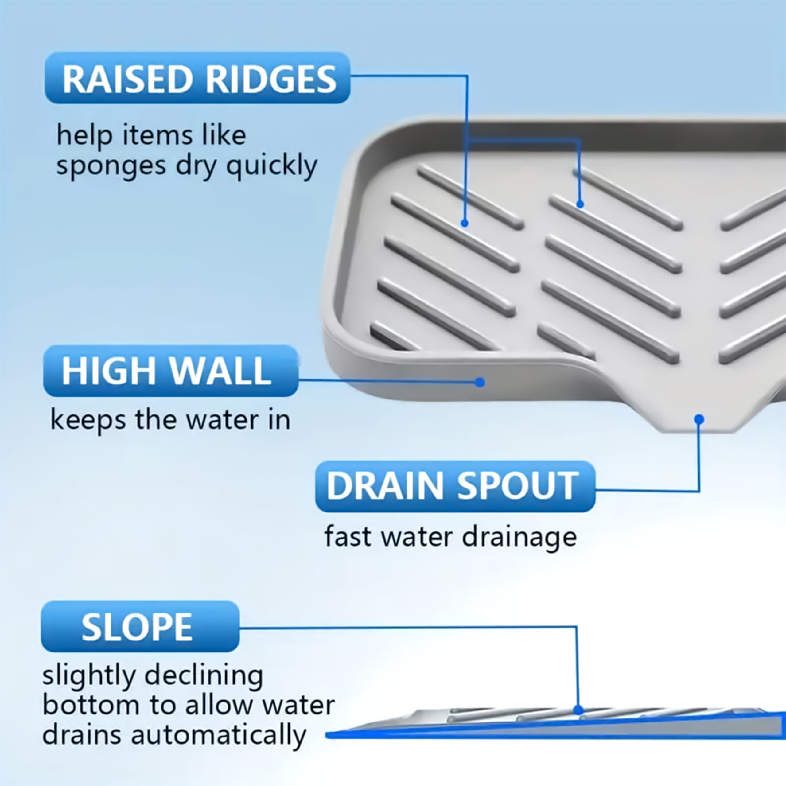 - DRAIN-EFFICIENT DESIGN: Raised ridges and a built-in drain spout let excess water flow directly into the sink – helping sponges, scrubbers, and soap dry faster and stay hygienic.