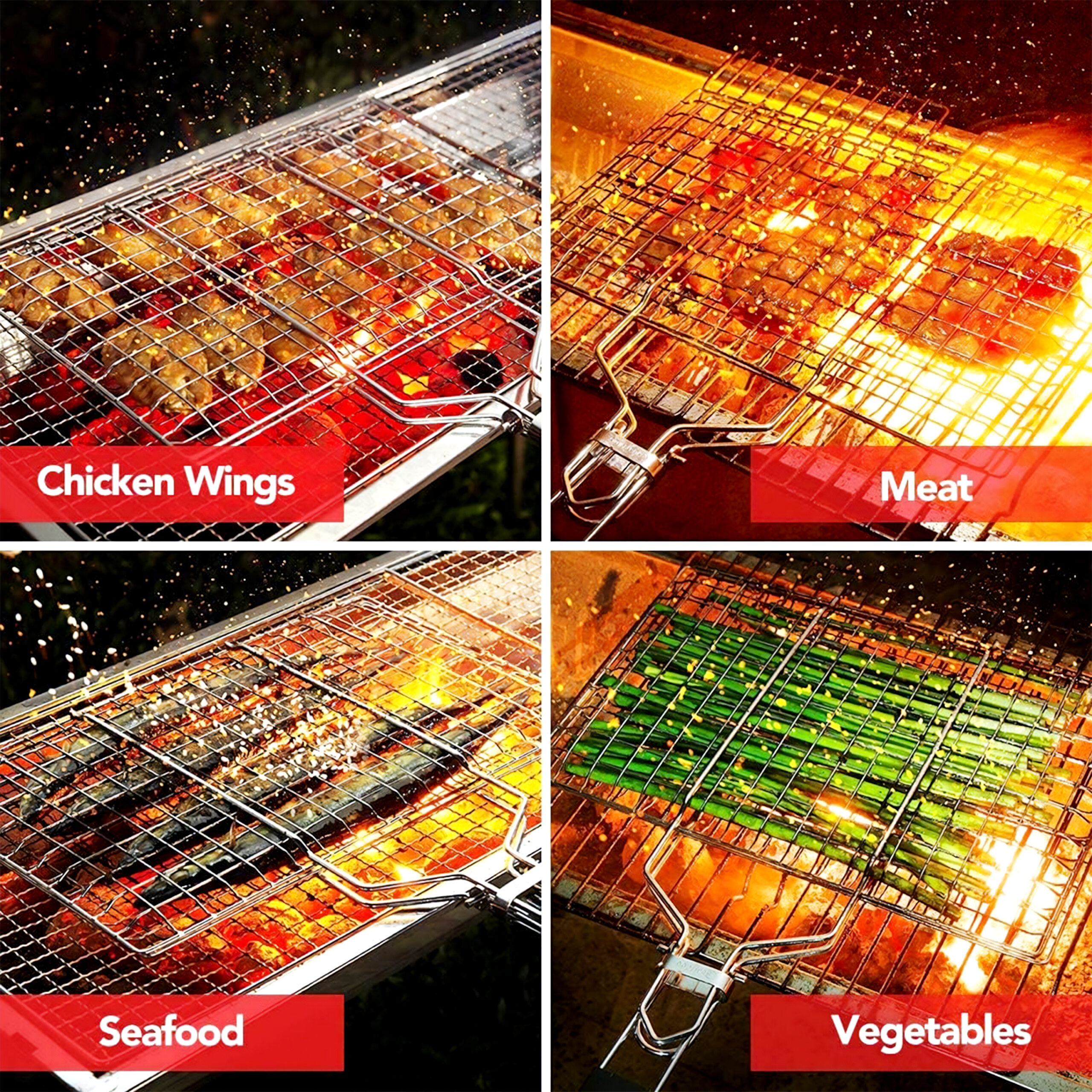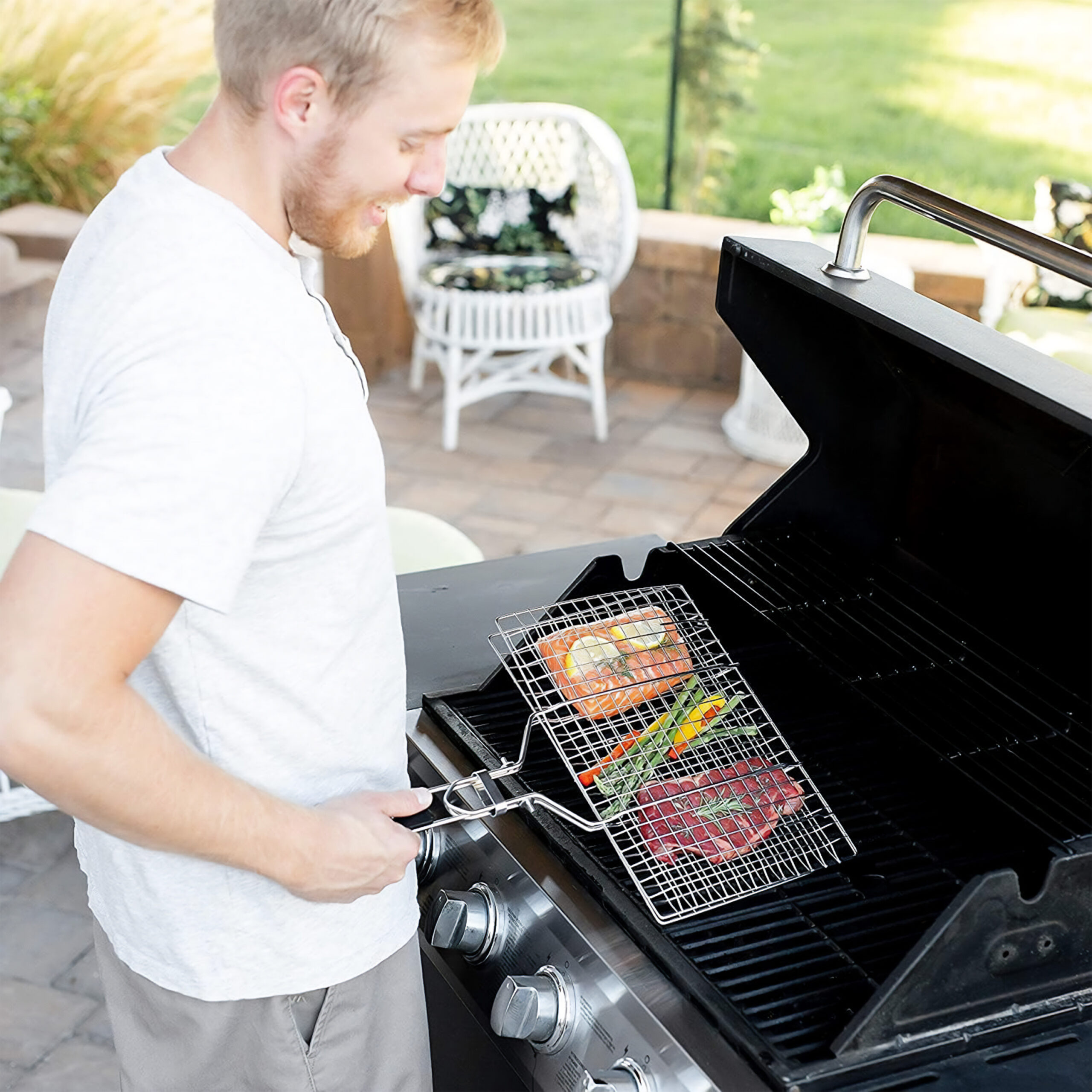 - CREATIVE LOCKABLE GRATE: Lockable grill grate locks foods in place and would not loosen when locked enable easy flipping of grilled foods like burger hamburger vegetable fish sea food chicken meat and any other fry items for camping outdoors picnic kitchen hotel family party etc.